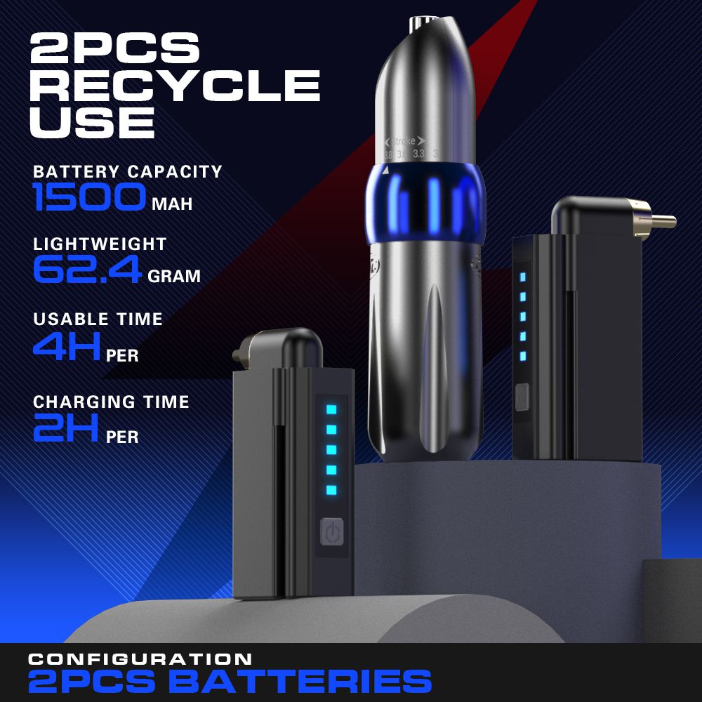 The tattoo kit comes with wireless battery, allows tattooing without wire restrictions and resumes traditional RCA connector operating mode when the battery runs out.