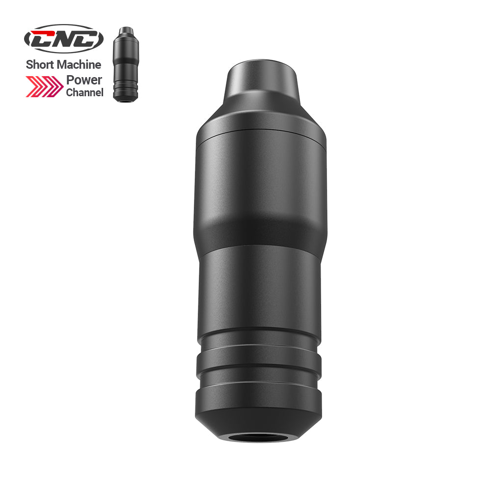 A short and portable tattoo pen machine, all parts integrated into the grip. It’s more suitable for modern tattoo style because it’s lighter and it has minimal self-resonance, allowing you to focus on the needle tip. It can draw delicate lines and make transitional soft shadows.