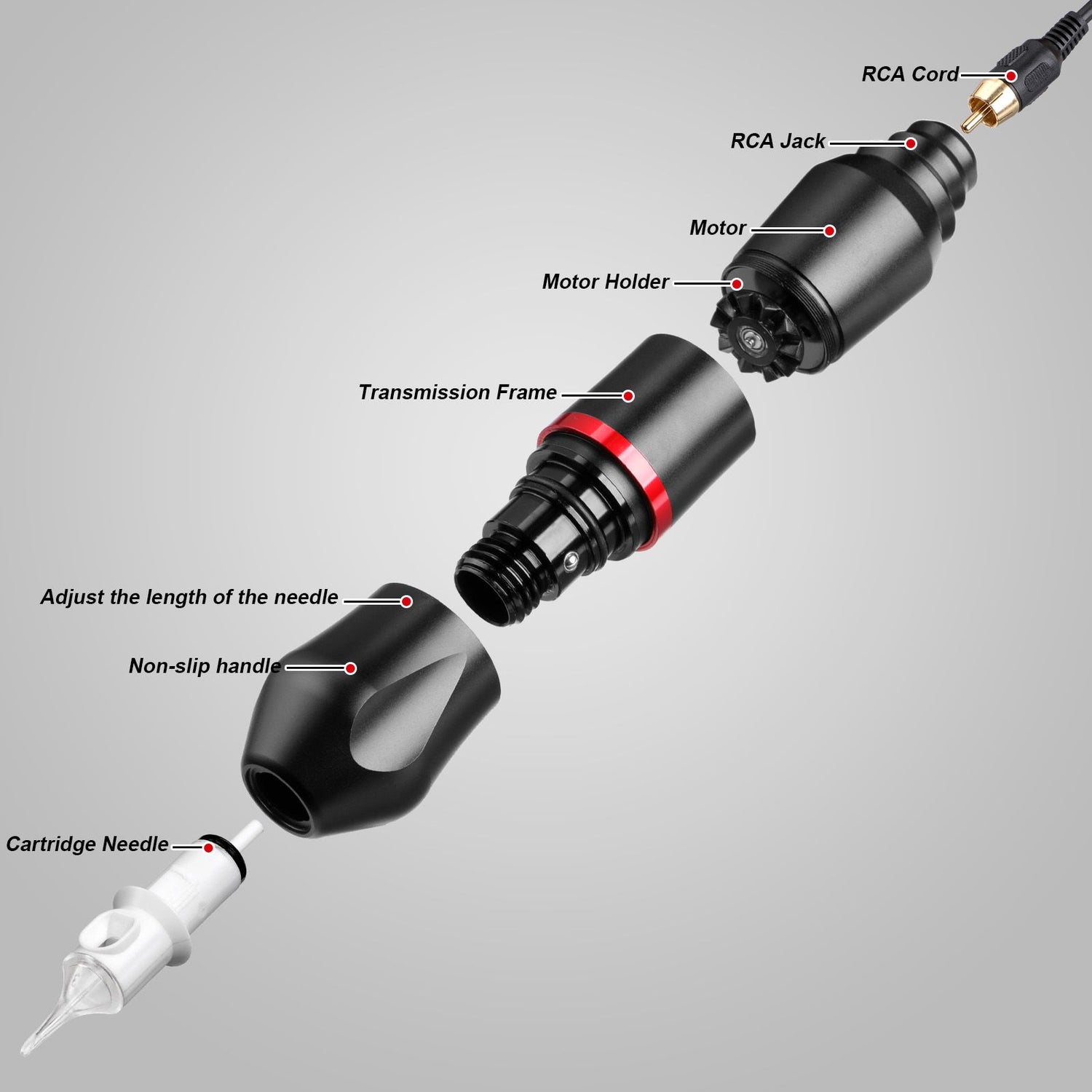 The tattoo kit is a complete tattoo kit, which includes all essential items when you get into tattooing. The rotary tattoo pen is designed to give you the closest feeling to the actual pen, easy to operate.