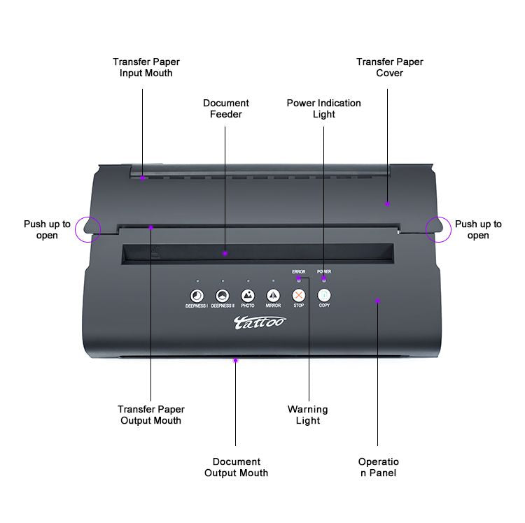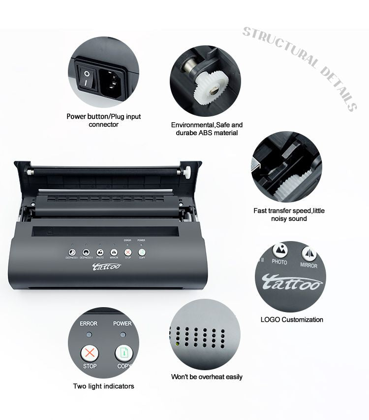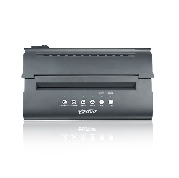 The updated tattoo transfer machine has a smaller size, faster transfer printing speed, lower noise, and more stable performance when compared to the previous model T102. In just a few steps, you can transfer your patterns onto transfer papers.